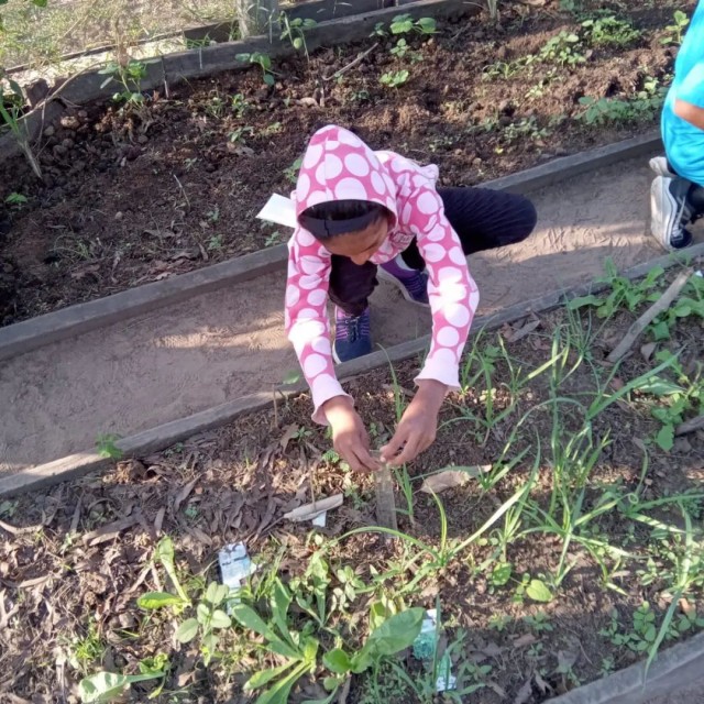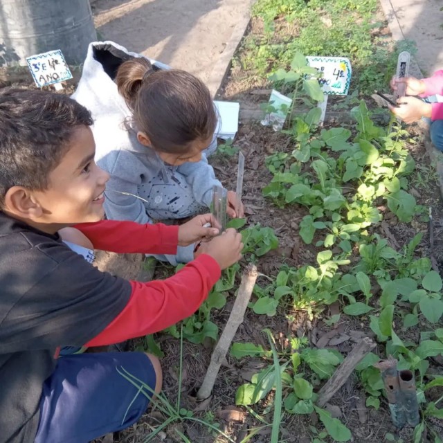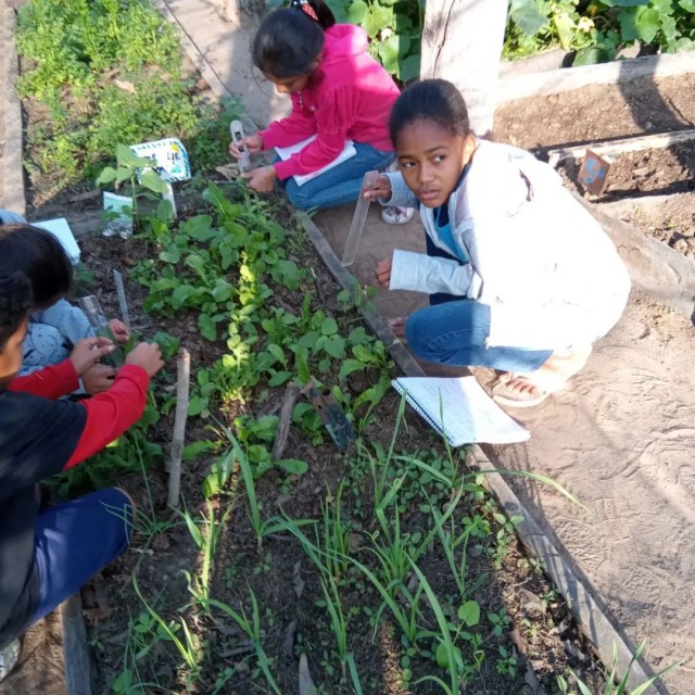 A atividade de retorno do bimestre na horta foi de observação e registro do desenvolvimento das hortaliças . Os alunos das turmas do 3º e do 4º ano realizaram a medição das plantações e fizeram as comparações com as medições que haviam registrado anteriormente