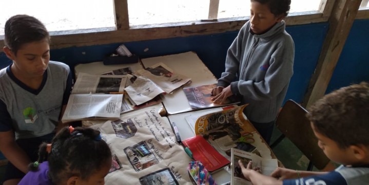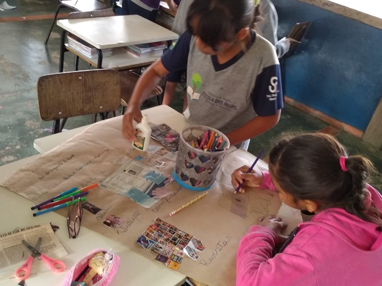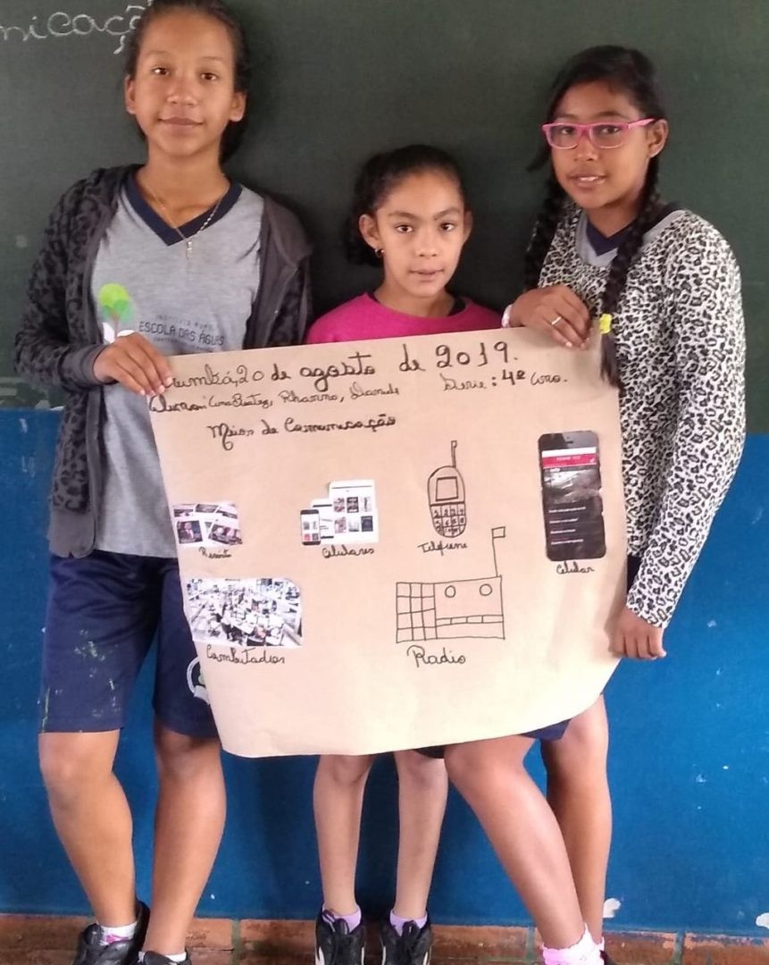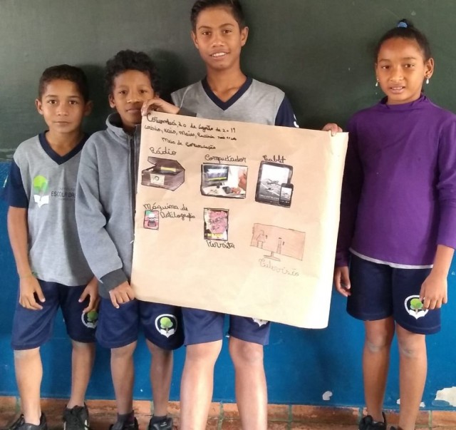 Os alunos do 3° e 4° ano, mediados pela professora Nádia, desenvolveram na aula de Comunicação e Mídias cartazes com desenhos e colagens de imagens, atividade com a qual puderam conhecer a história dos meios de comunicação existentes no passado.