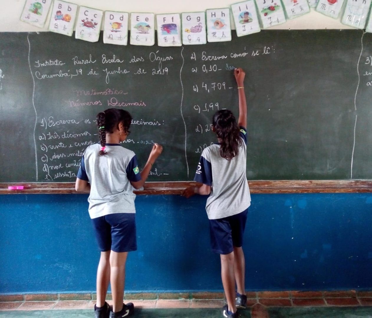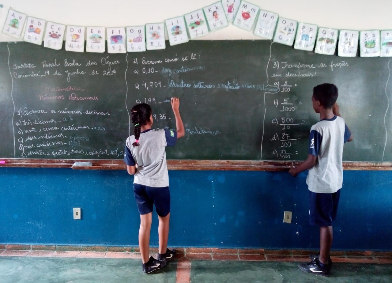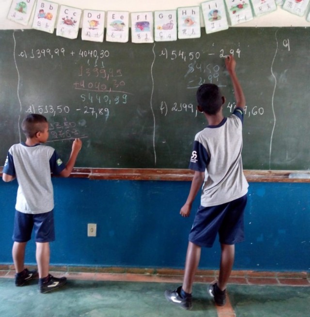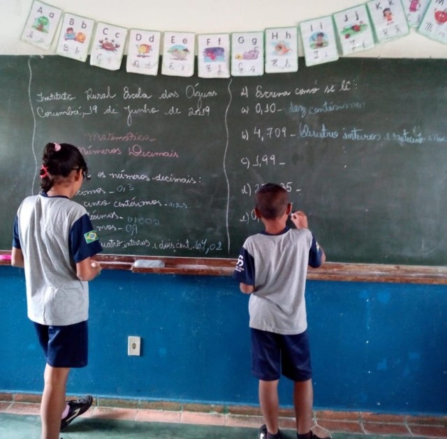 Aprendendo as quatro operações com números decimais. Os estudantes do 5° ano realizaram atividades dirigidas, impressas e no quadro envolvendo os decimais: escrita, representação, transformação de frações, ordem crescente e decrescente, adição, subtração, multiplicação e divisão. Além da execução de jogos pedagógicos.