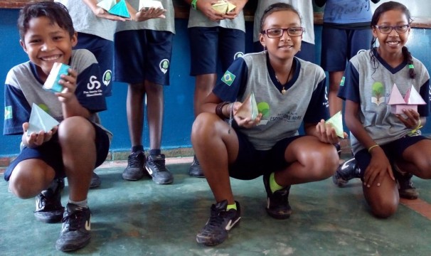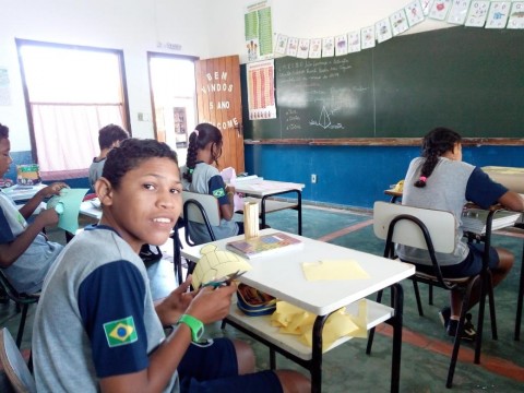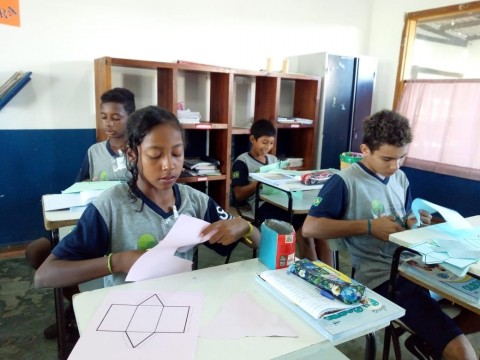 Durante a aula de Matemática os estudantes do 5° Ano montaram sólidos geométricos (prismas e pirâmides). Os educandos foram orientados a recortar e colar os moldes das figuras geométricas e em seguida preencheram tabelas com informações sobre as figuras não planas. A atividade teve como objetivo fazer com que o educando reconheça os sólidos geométricos como figuras não planas do tipo poliedro; identificar face, aresta e vértice; e reconhecer as características dos prismas e pirâmides, além de associar essas formas a objetos do cotidiano.