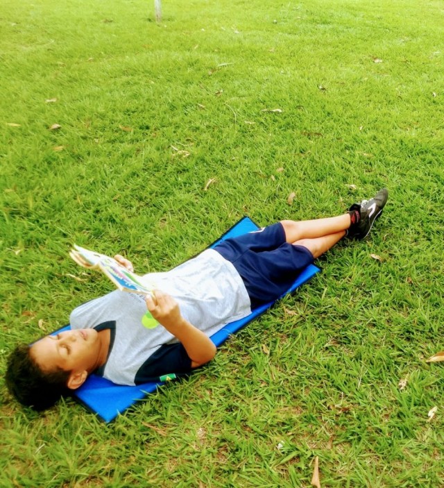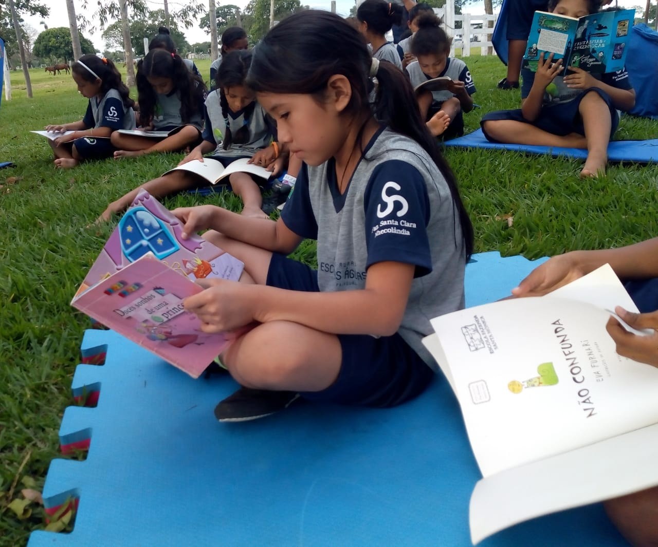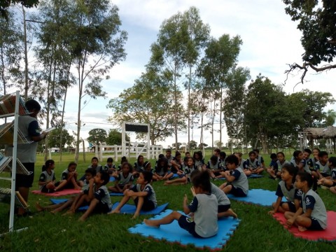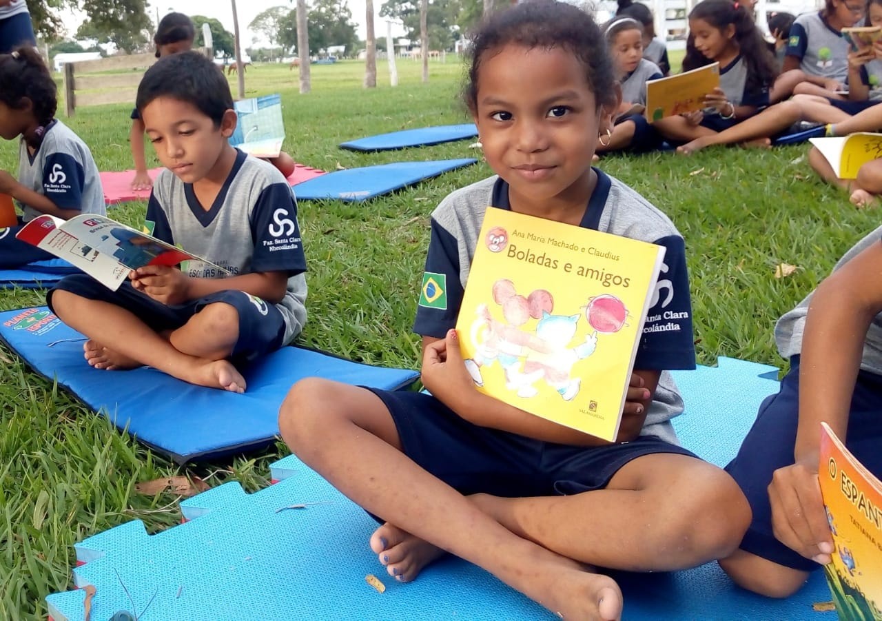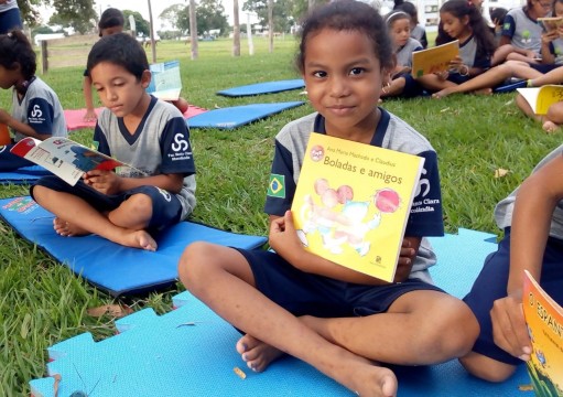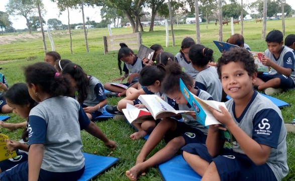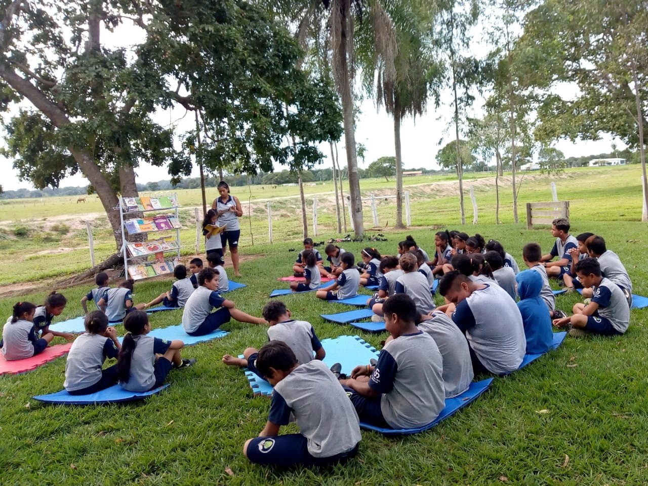Ao final da tarde, os estudantes e professoras se reuniram para leitura ao ar livre.