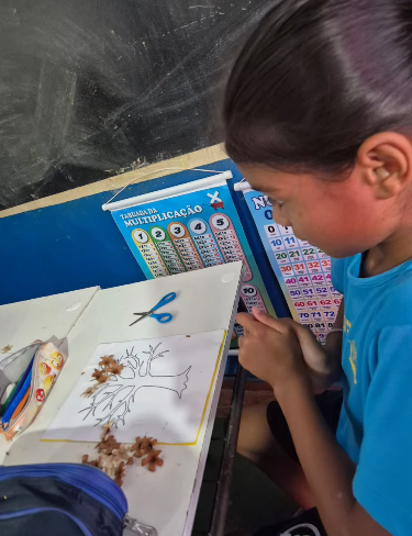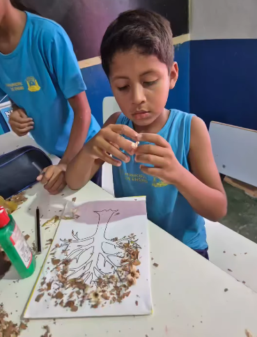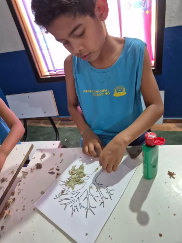 Durante a aula de Artes com a professora Evelyn Cristina, os alunos do 3º ano foram estimulados a explorar os arredores da escola em busca de folhas, galhos e flores. Essa prática não apenas promove o reaproveitamento de materiais naturais já presentes no ambiente, como também estimula a valorização da natureza, evitando prejudicar as plantas.