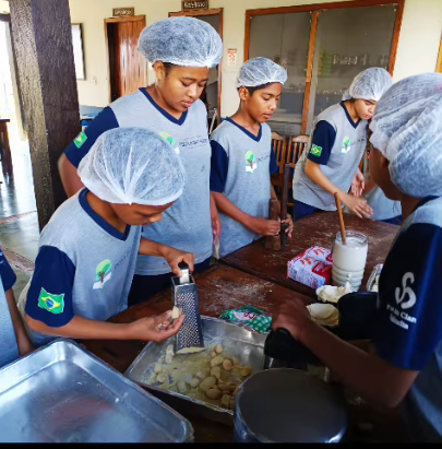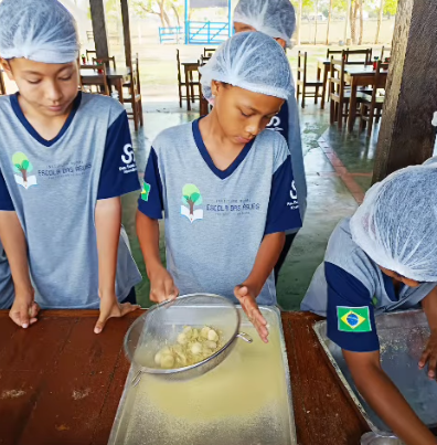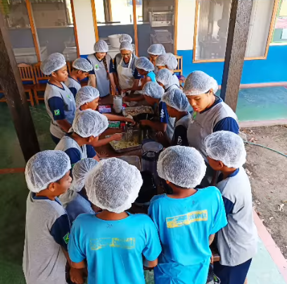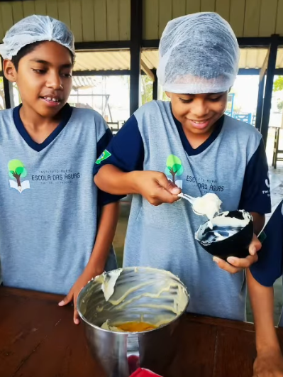 Como parte do projeto *Saberes e Sabores do Pantanal* , os alunos do 4º e 5º ano, orientados pelo professor Wanderley Catarino e a educadora Euzília França, prepararam um bolo de jatobá após colheita e uma pesquisa sobre o fruto típico da região. A atividade foi uma oportunidade de resgatar saberes tradicionais, valorizar o bioma local e vivenciar a cultura pantaneira. Os alunos participaram de todo o processo e se encantaram com o sabor e os benefícios do jatobá. O bolo foi compartilhado entre todos no lanche.