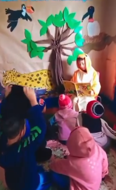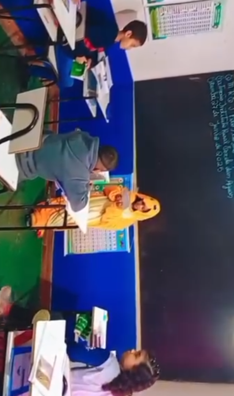 Na atividade de leitura, a professora Jacqueline Lima Monteiro introduziu o personagem Sr. Dino para incentivar e encorajar a turma do primeiro ano a ler , resultando em um compartilhamento animado de histórias nas outras turmas.