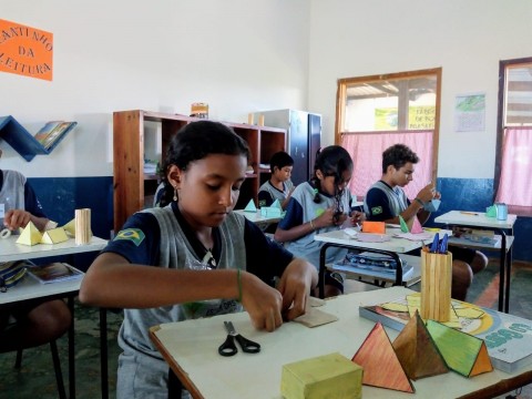 Durante a aula de Matemática os estudantes do 5° Ano montaram sólidos geométricos (prismas e pirâmides).